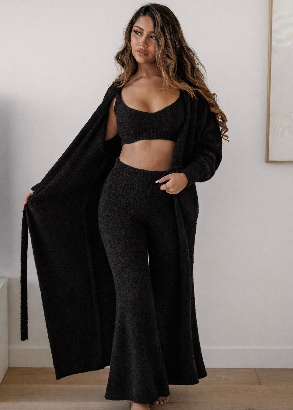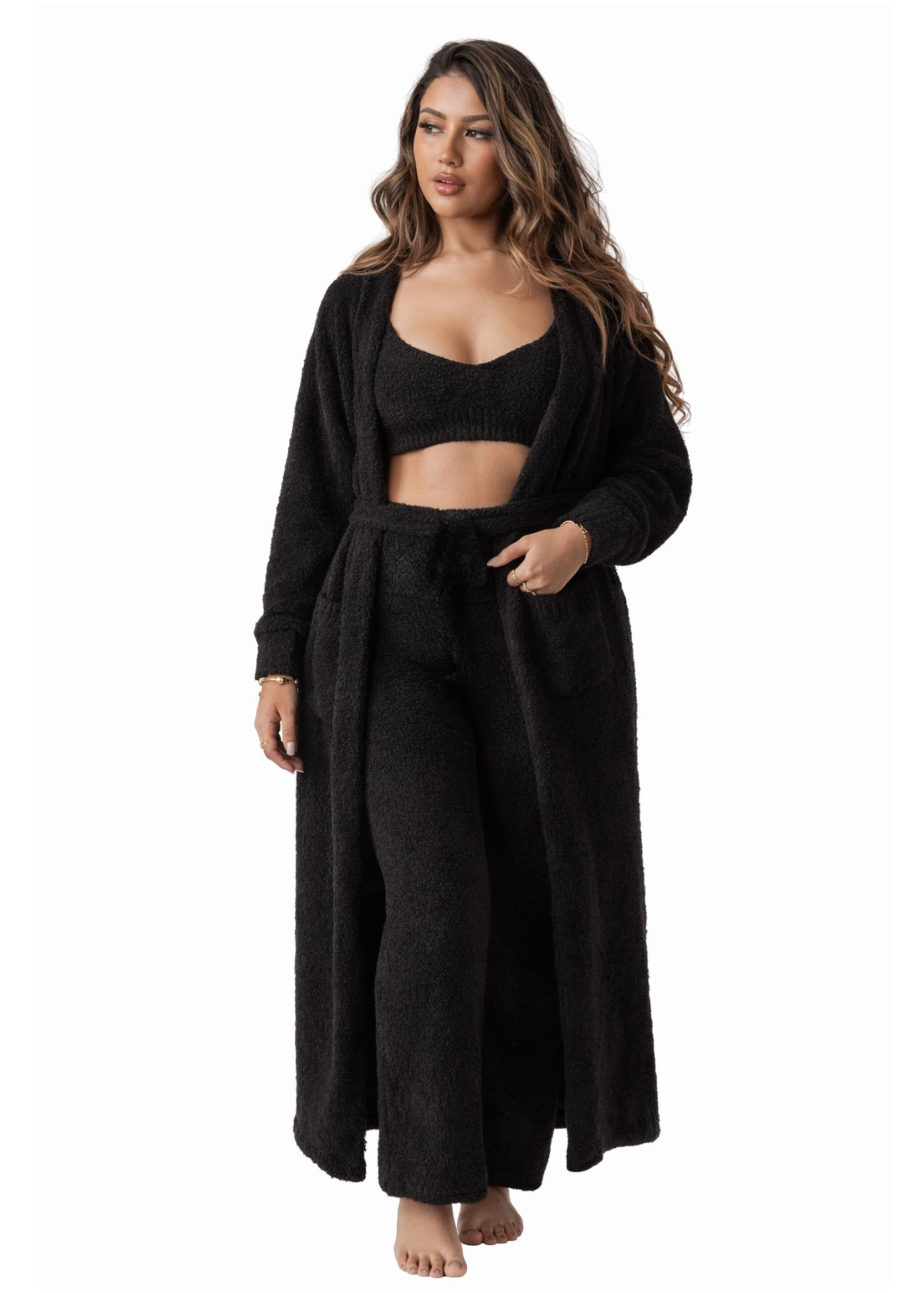 AFTERGLOW ROBE + FLARED PANTS + CROP SINGLET TEDDY (3-PIECE SET) SULTRY BLACK